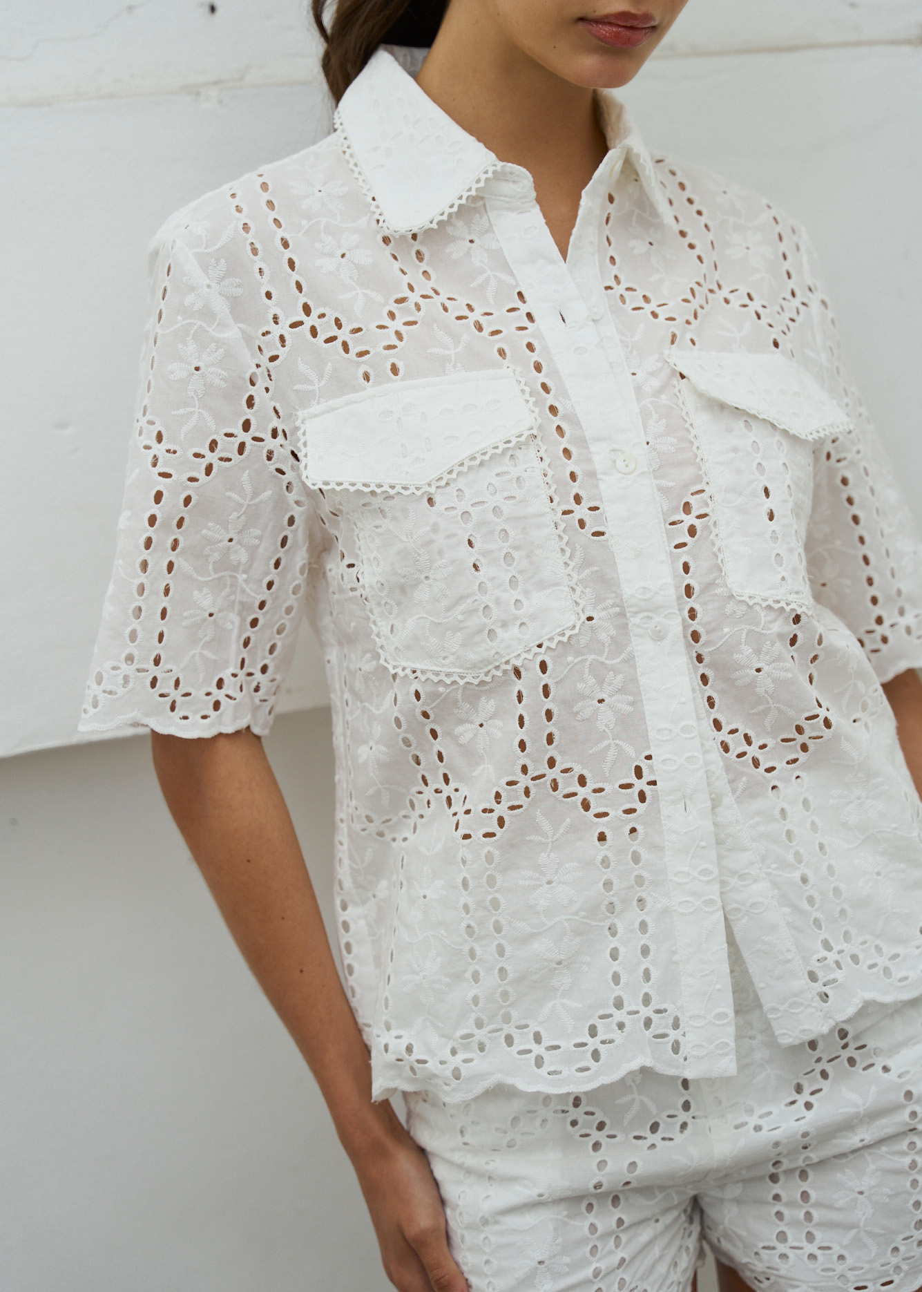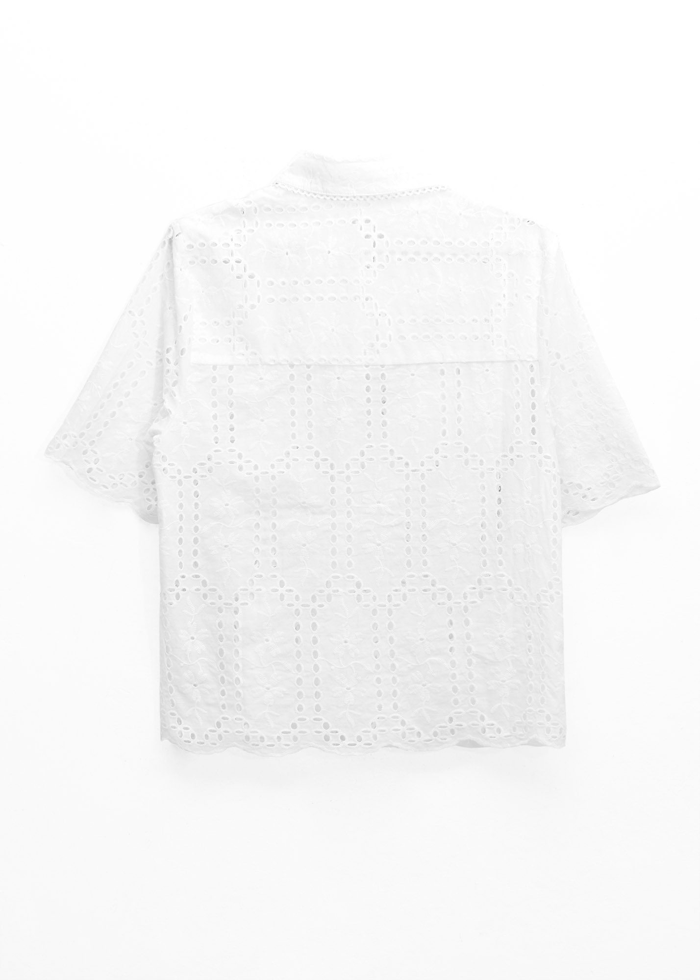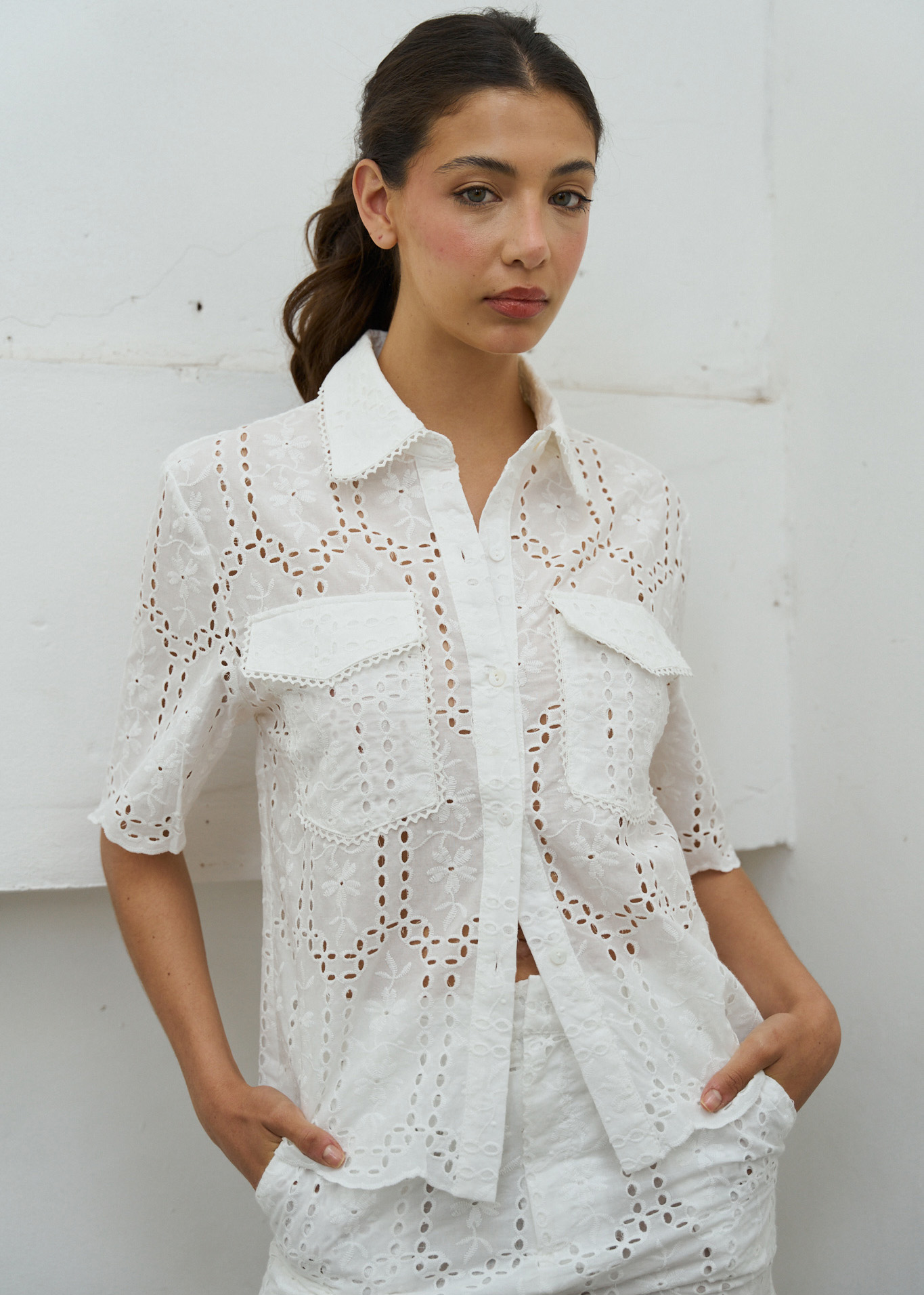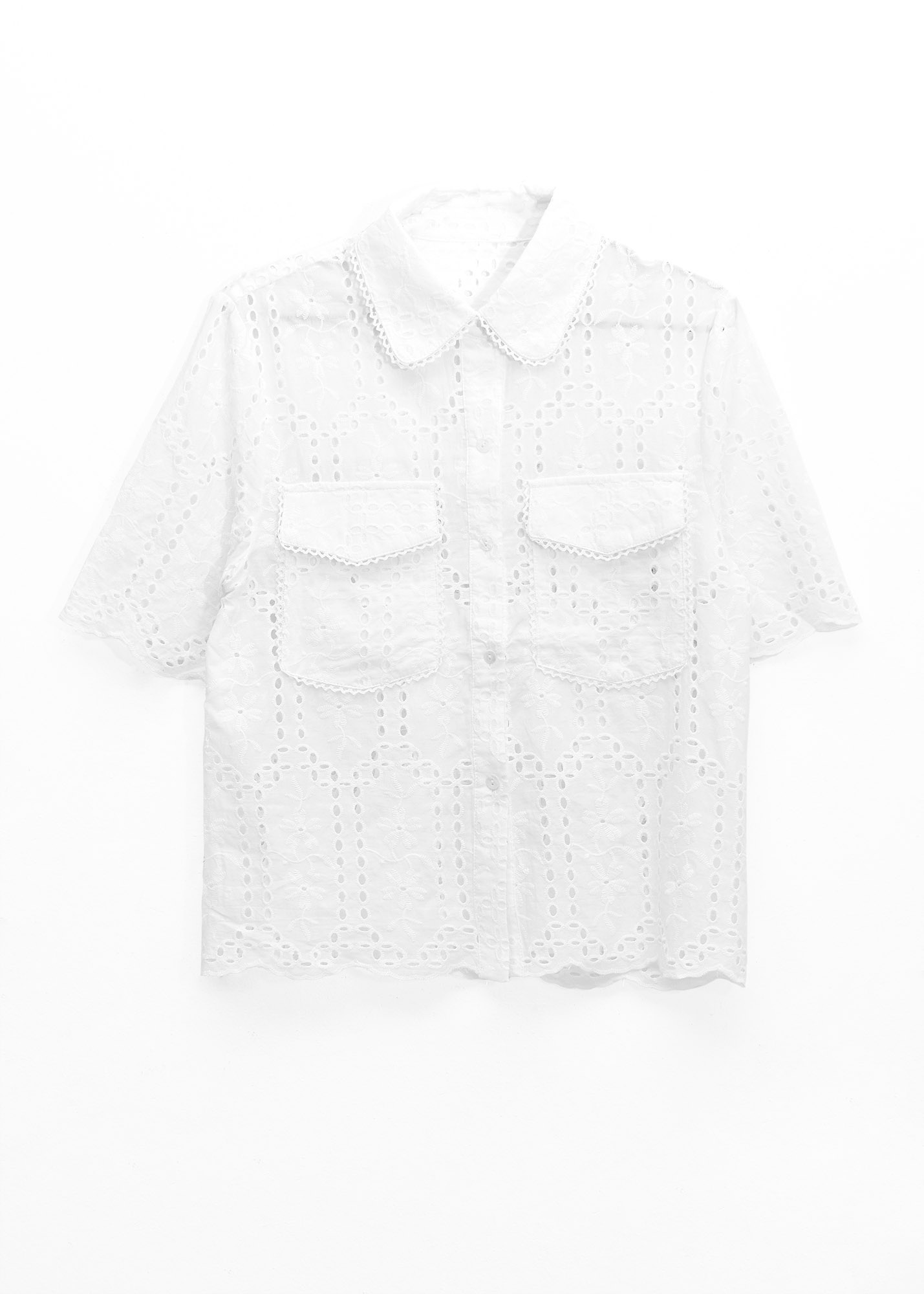 Camisa de broderie suelto, con bolsillos frontales, botones al tono y terminación festoneada en ruedo y cuello