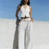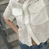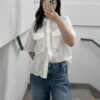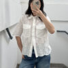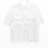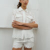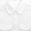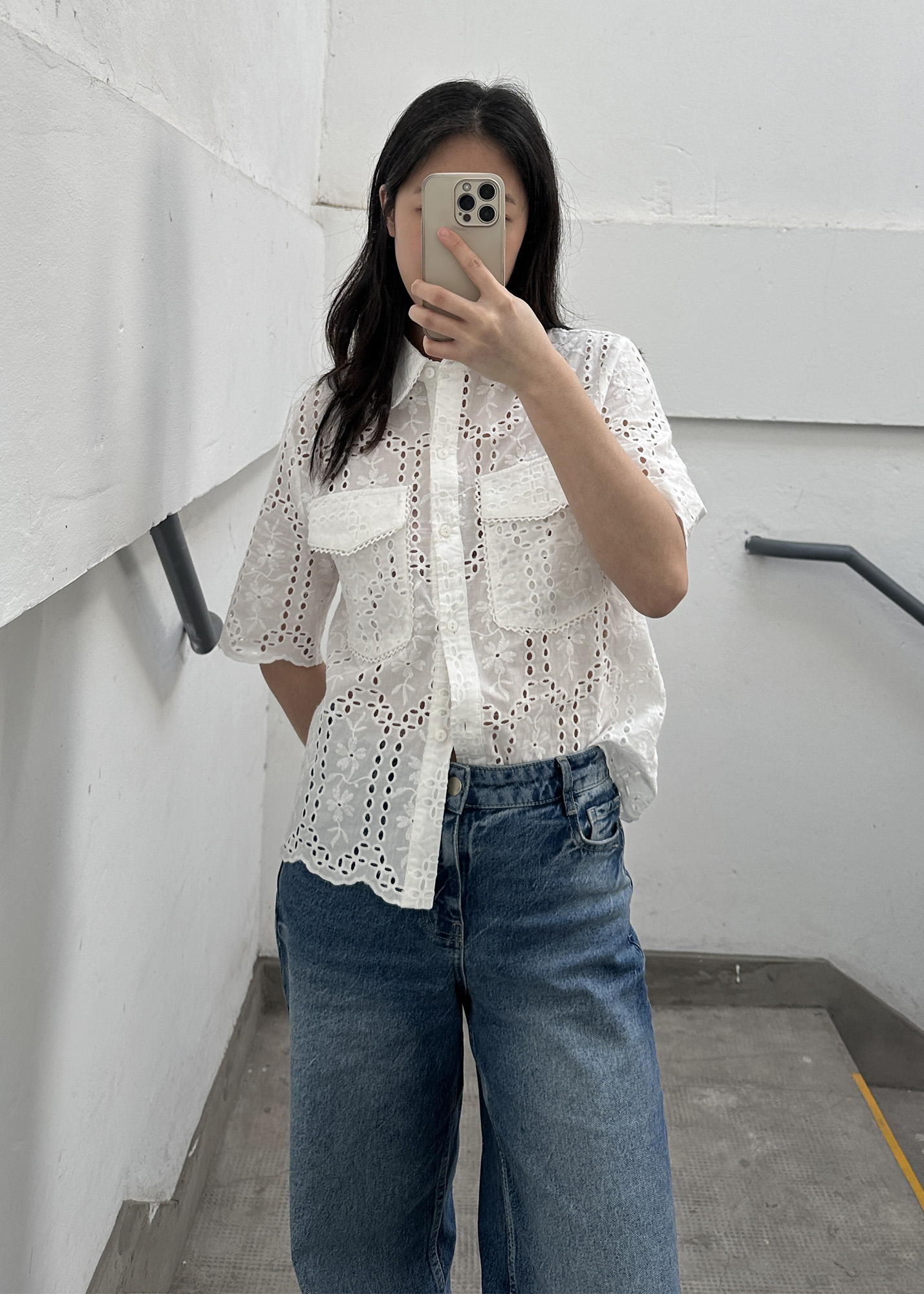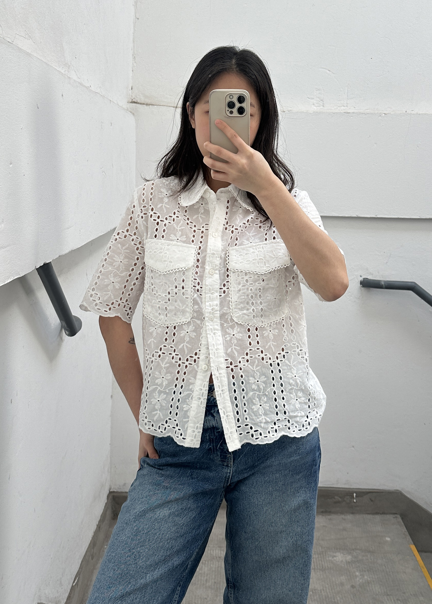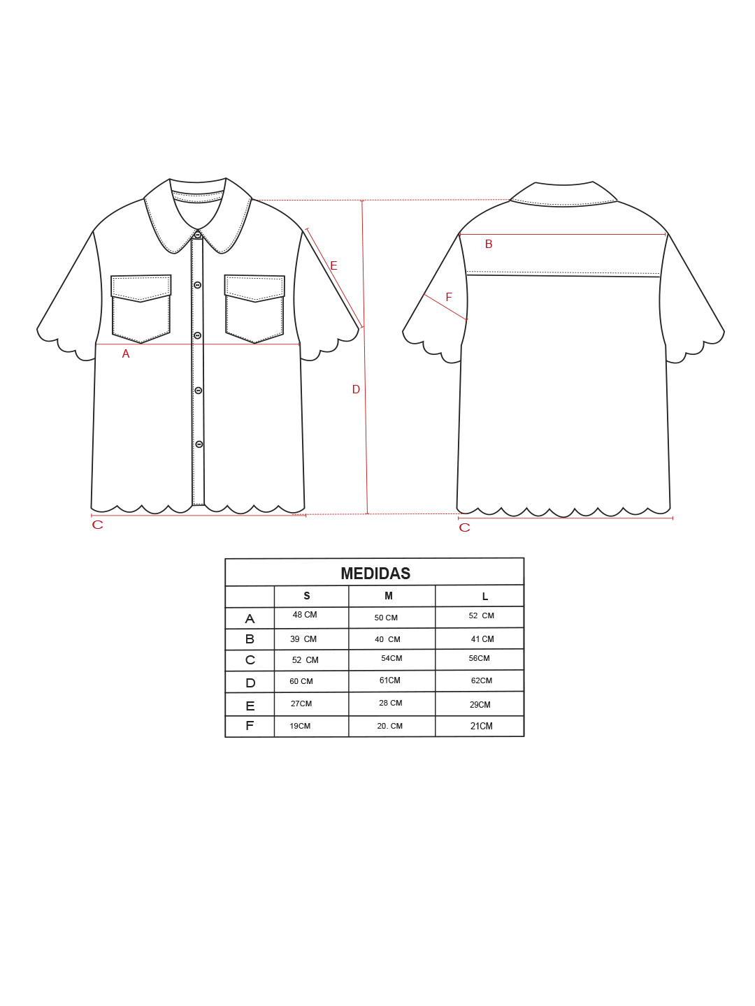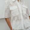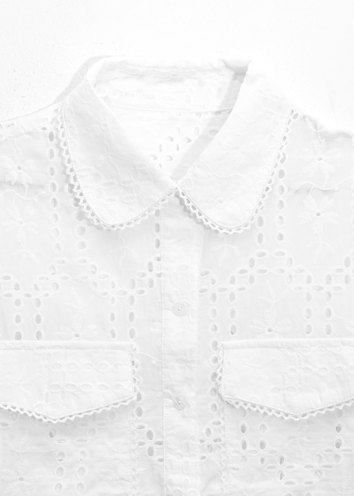 Camisa de broderie suelto, con bolsillos frontales, botones al tono y terminación festoneada en ruedo y cuello