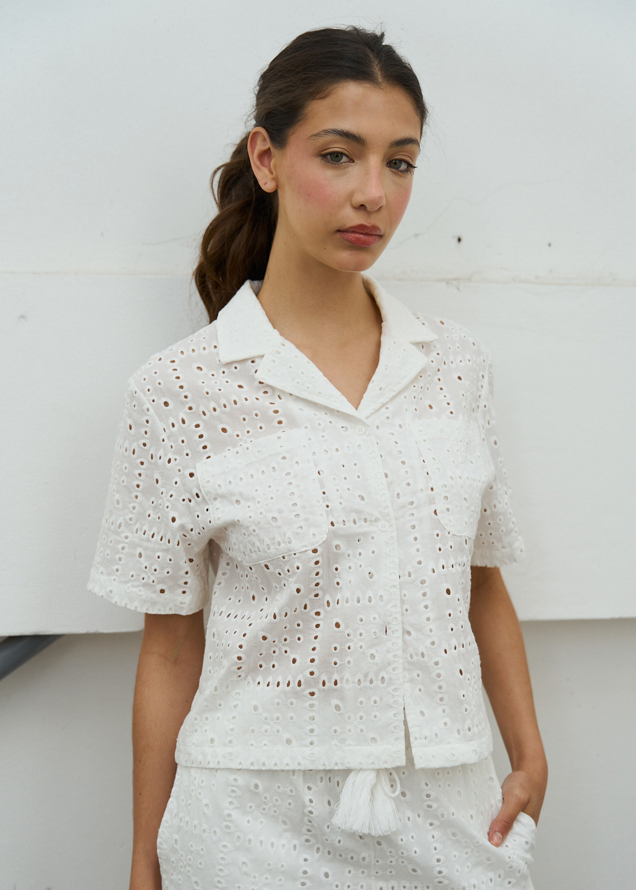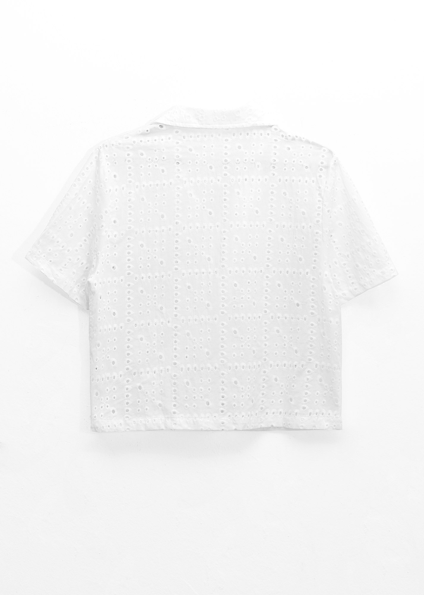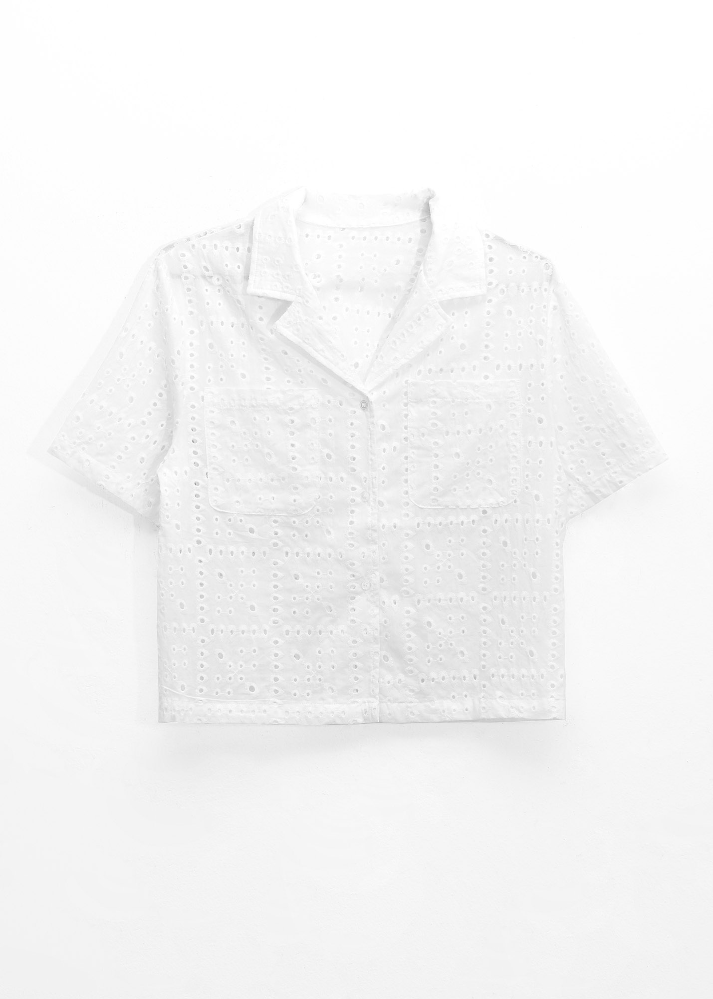 Camisa de broderie, cuello camisero clásico, con botones y detalle de bolsillos delantero