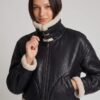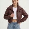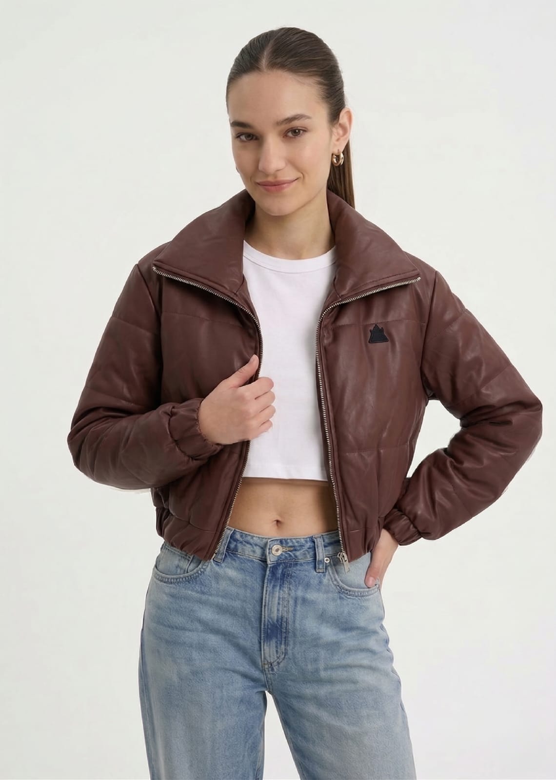 Abrigo estilo puffer de cuero con cuello alto, bolsillos y cierre. Tiene elástico en la cintura y en puños