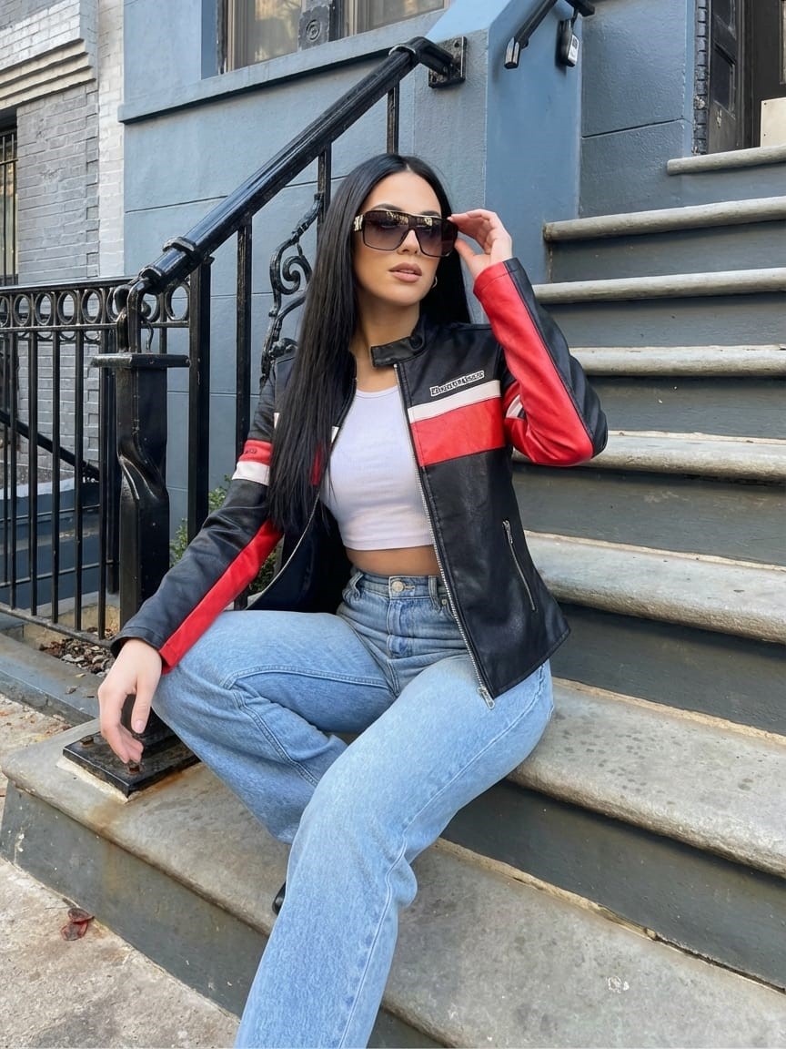 Abrigo chaqueta de cuero entallado al cuerpo con detalle de rayas colores combiandos, viene con bolsillo real incluído con el cierre