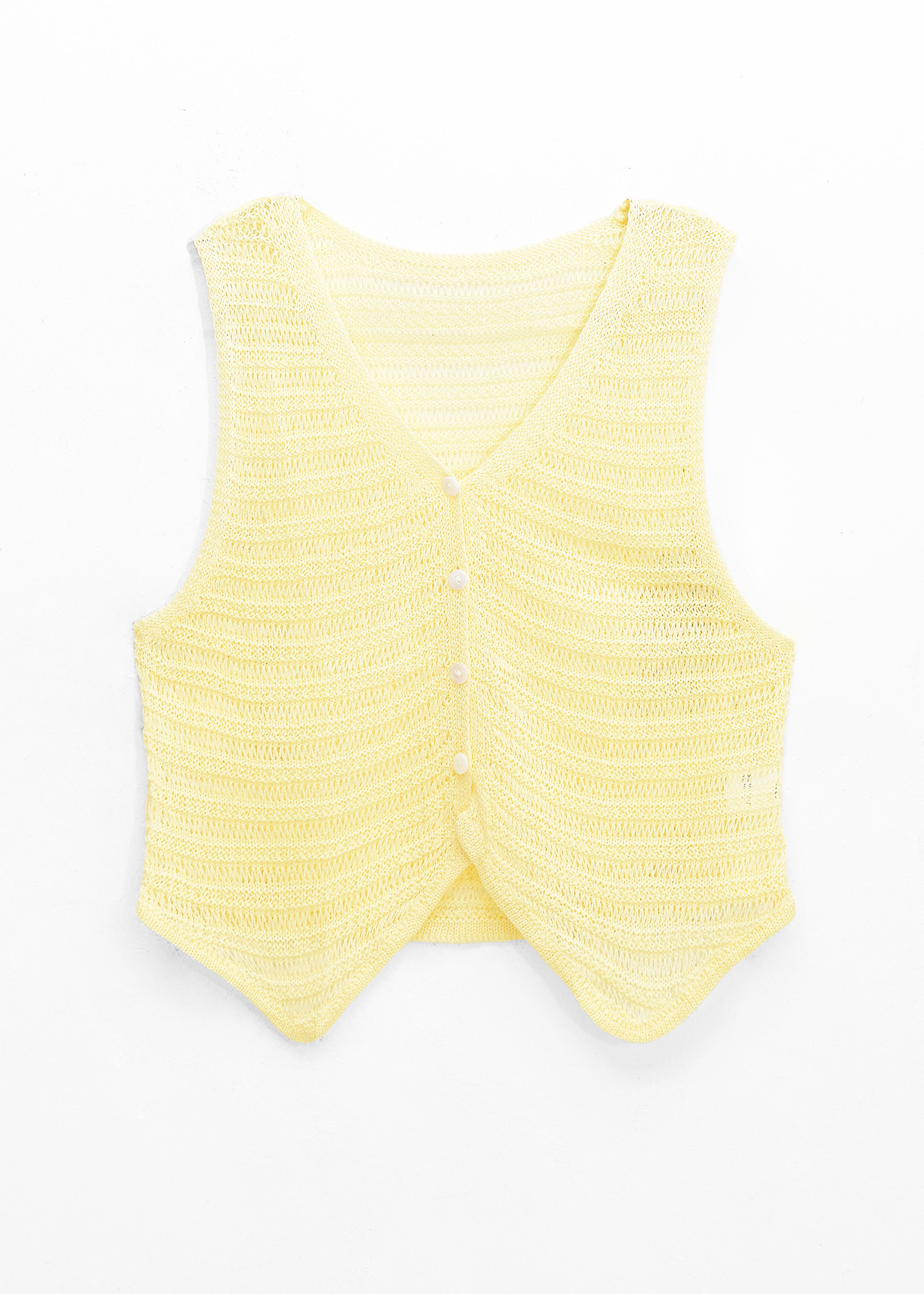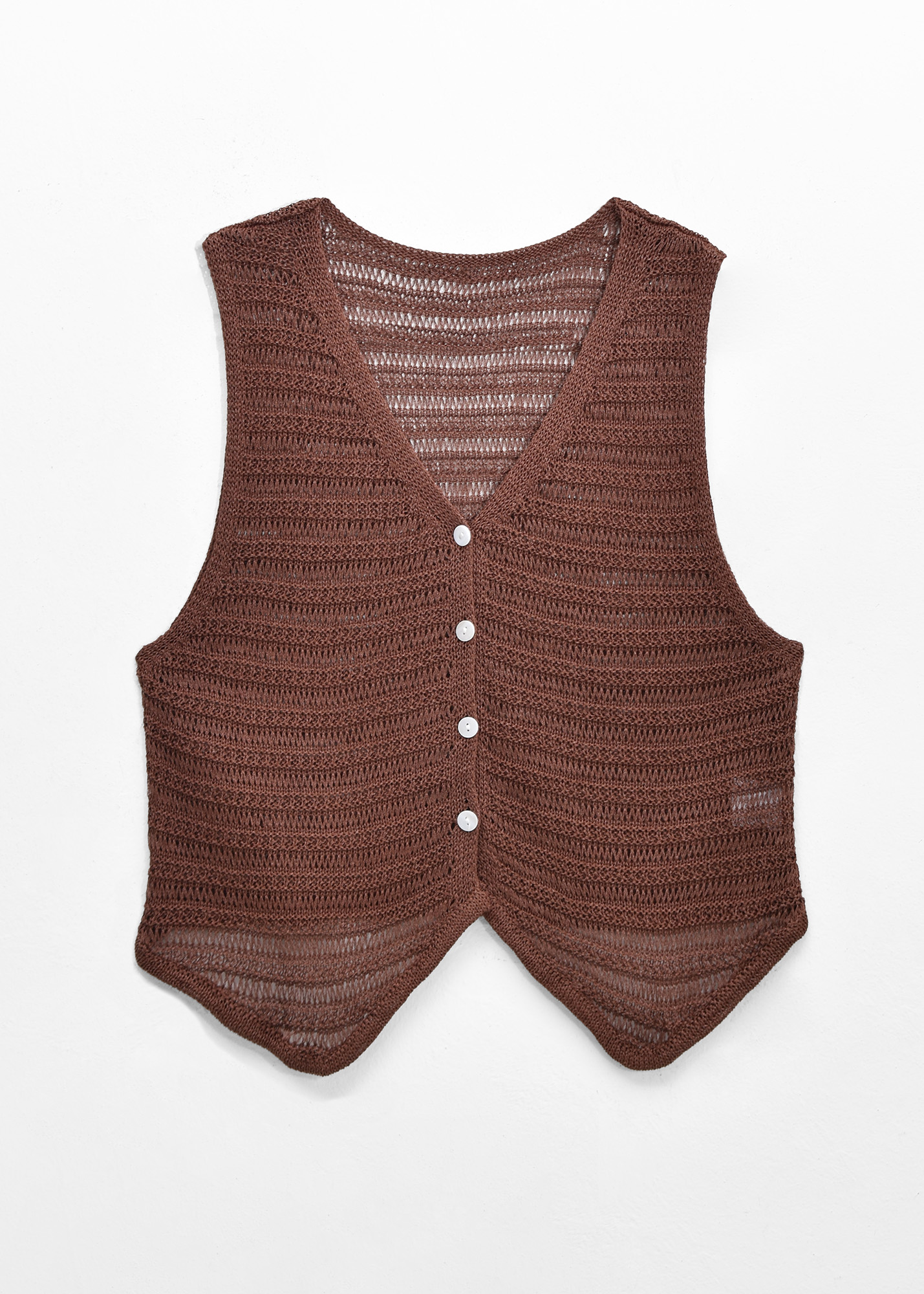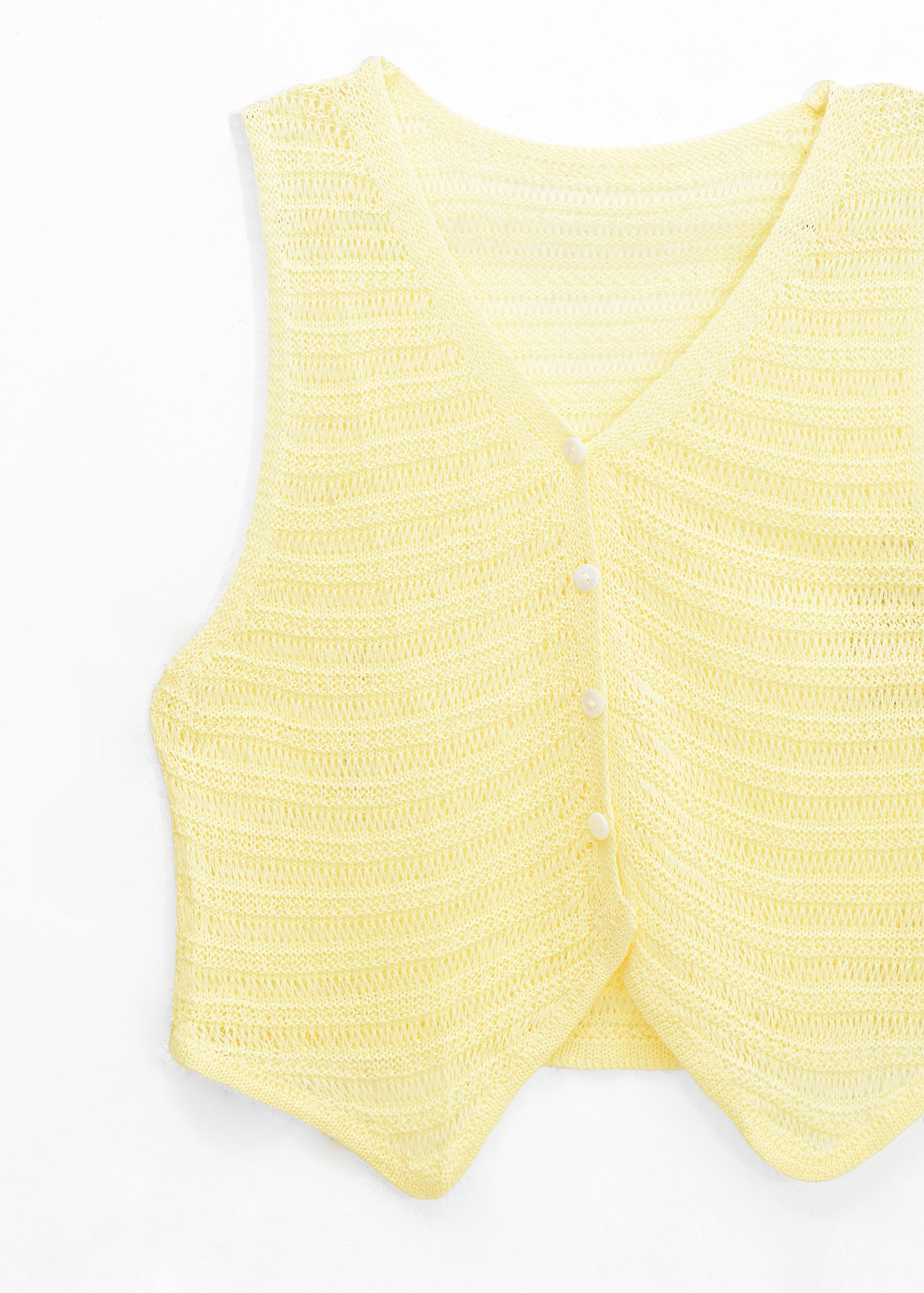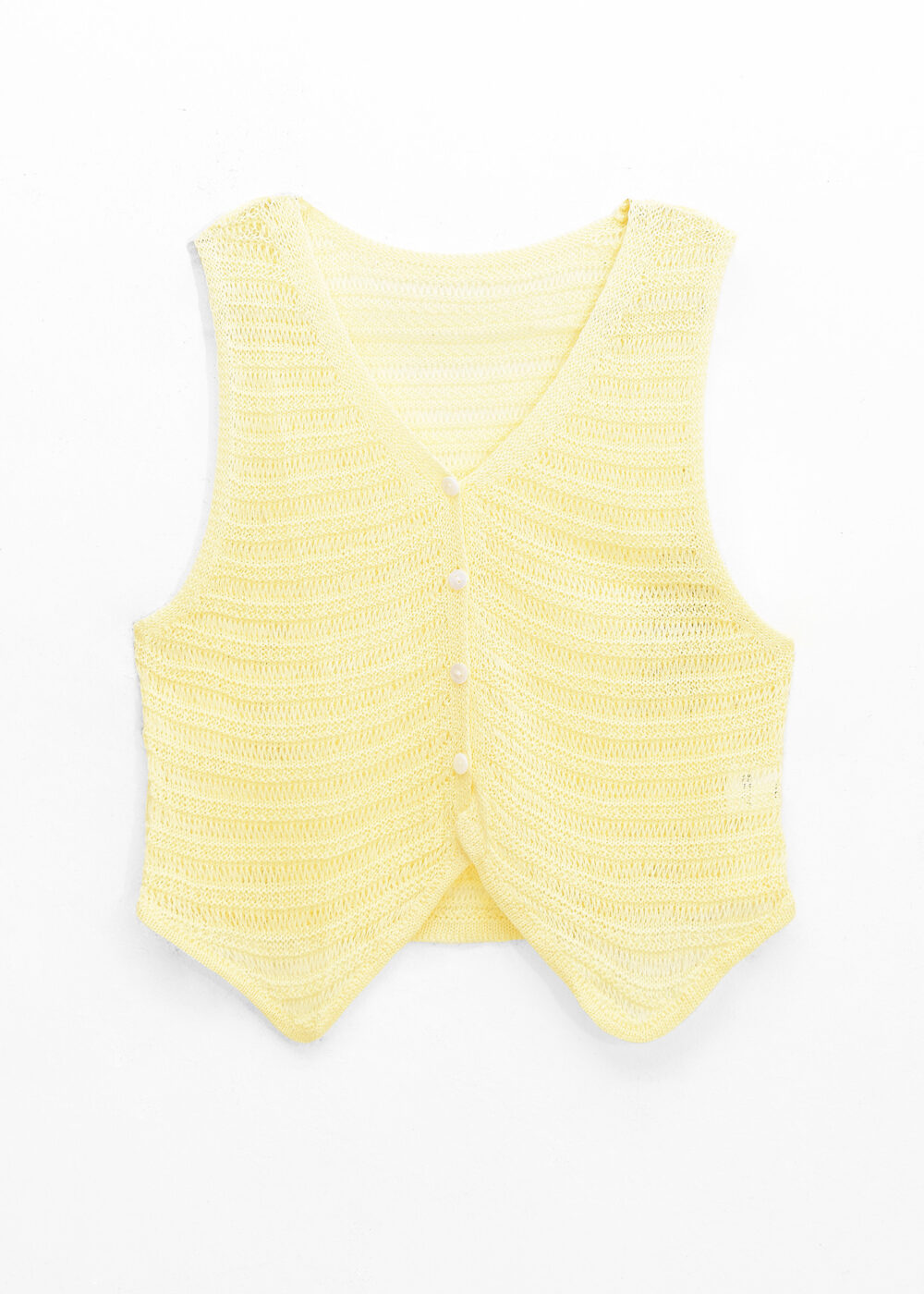 Chaleco de tejido fino, escote en V, botones delantero y detalle de tejido calado