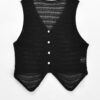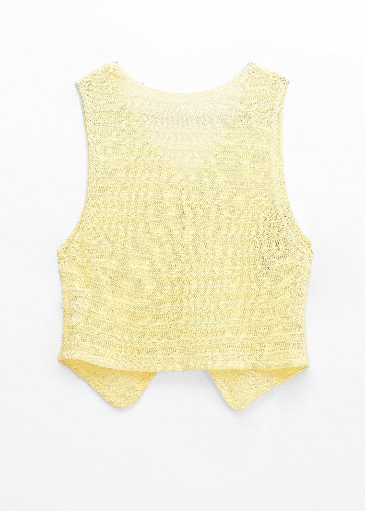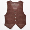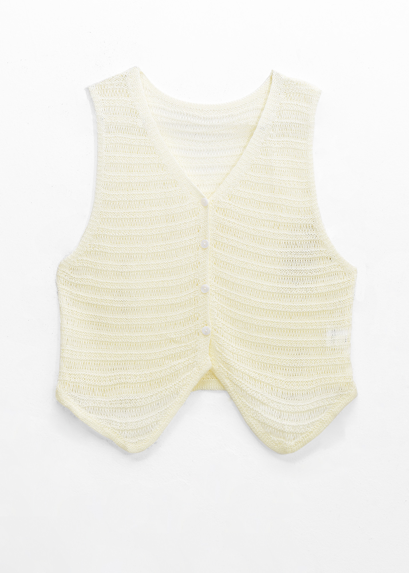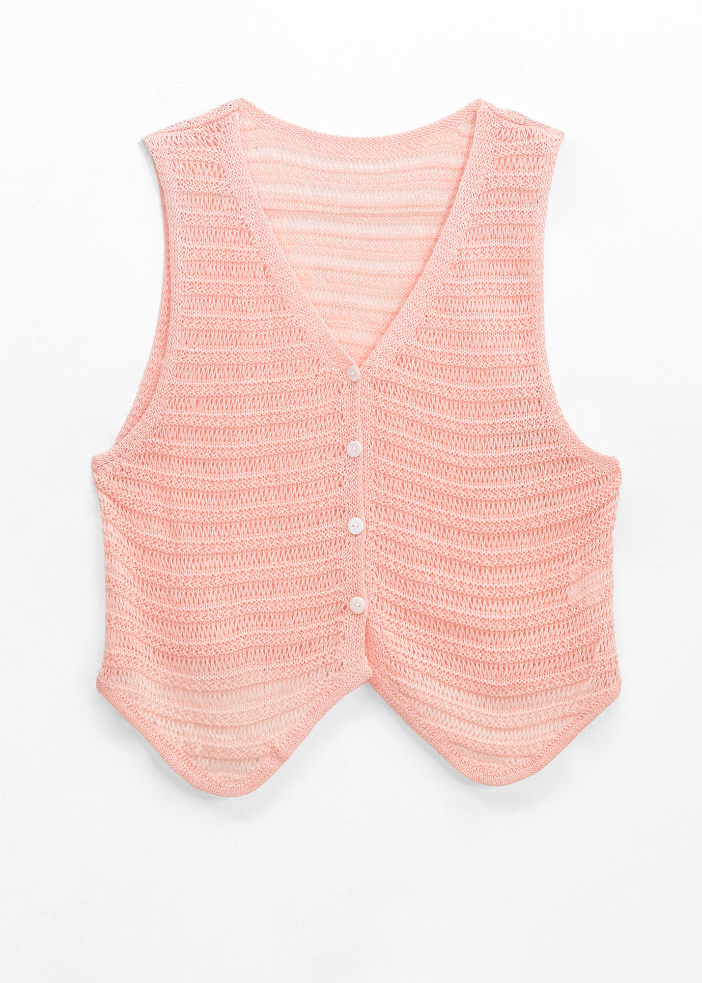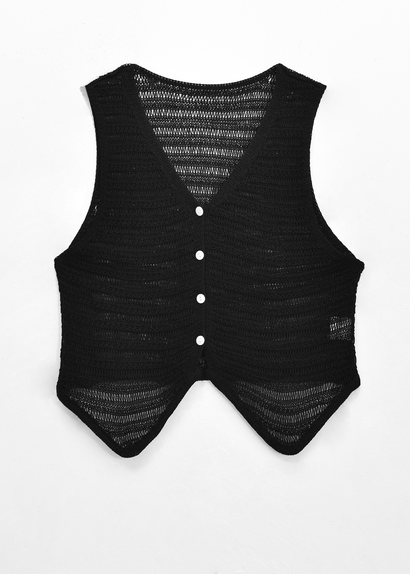 Chaleco de tejido fino, escote en V, botones delantero y detalle de tejido calado