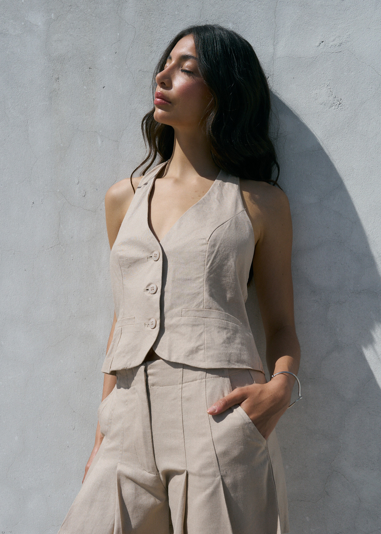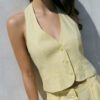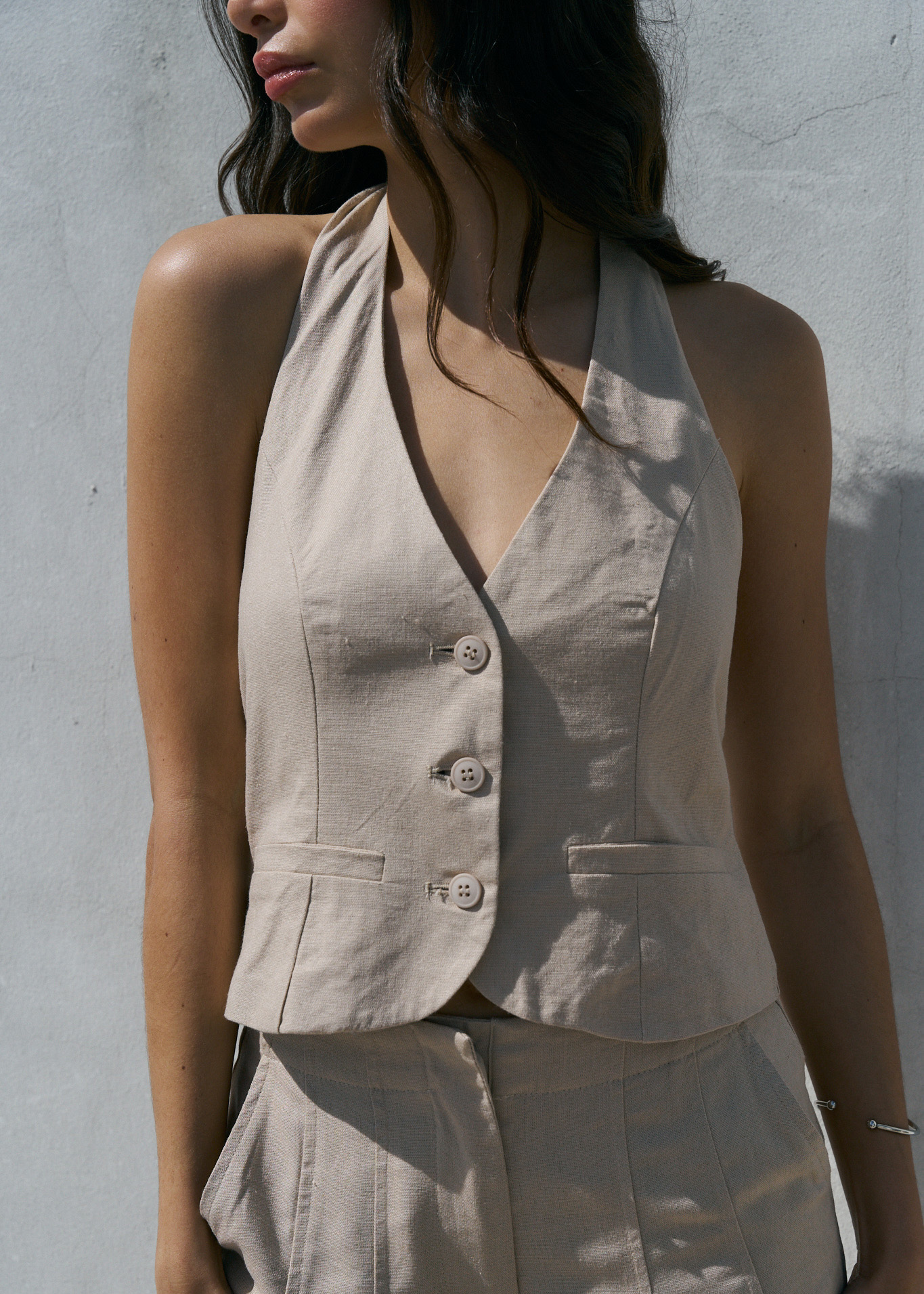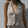 Chaleco top halter de lino, escote en V, con botones y bolsillos decorativos