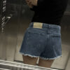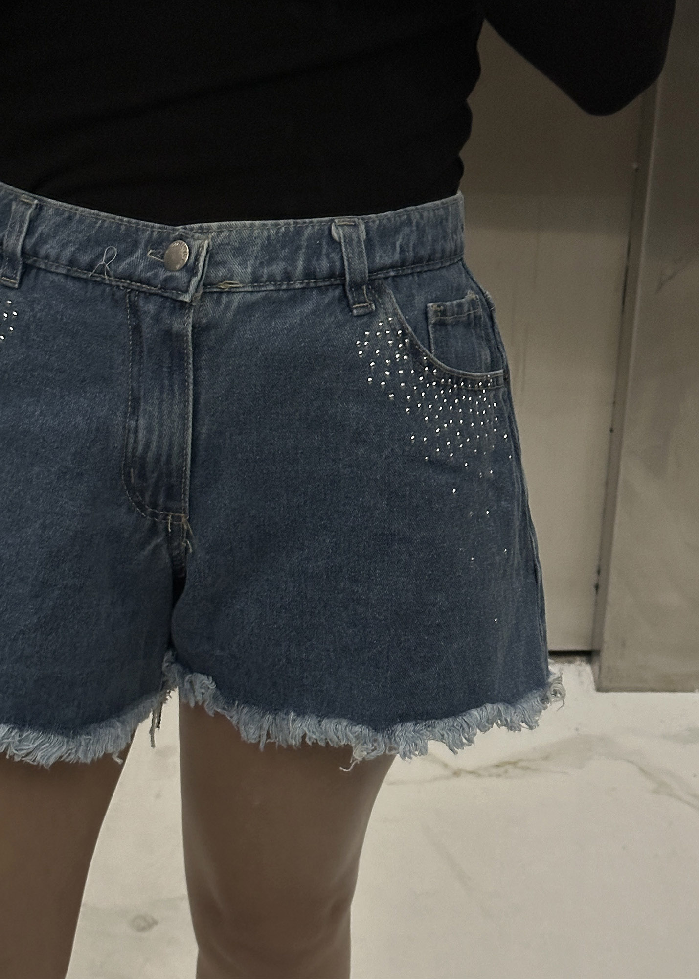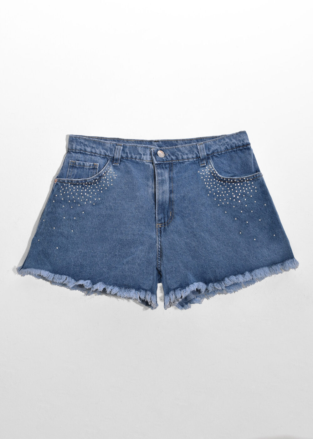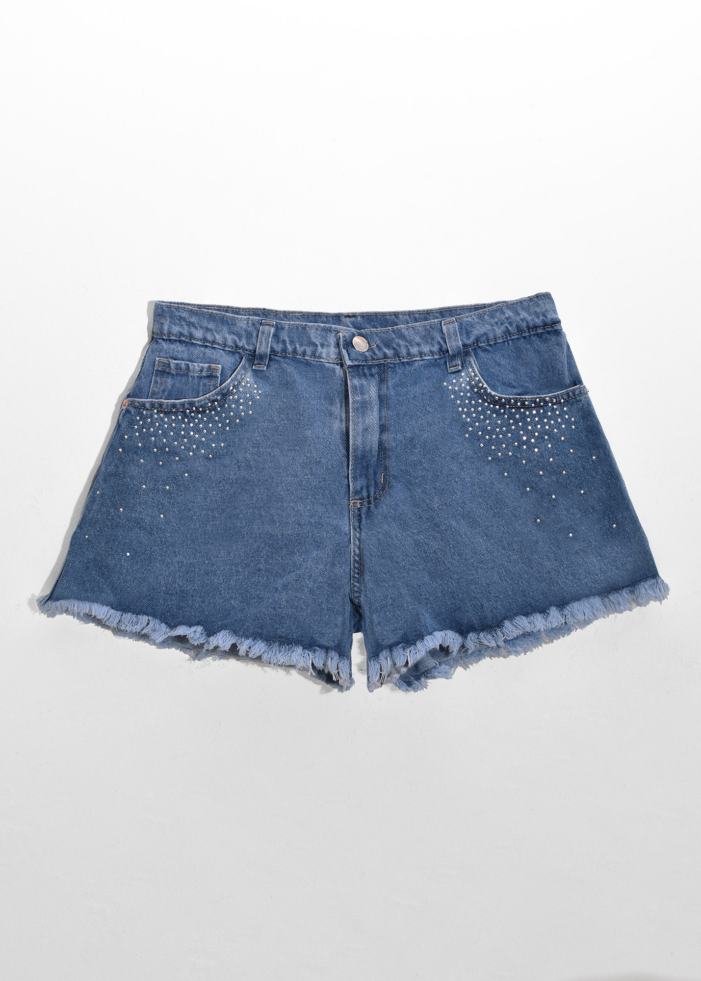 Short de jean corte estilo A – LINE, con detalle de fleco en ruedo y hotfix en forma de degradé alrededor de los bolsillos delanteros Composición: 100% algodón