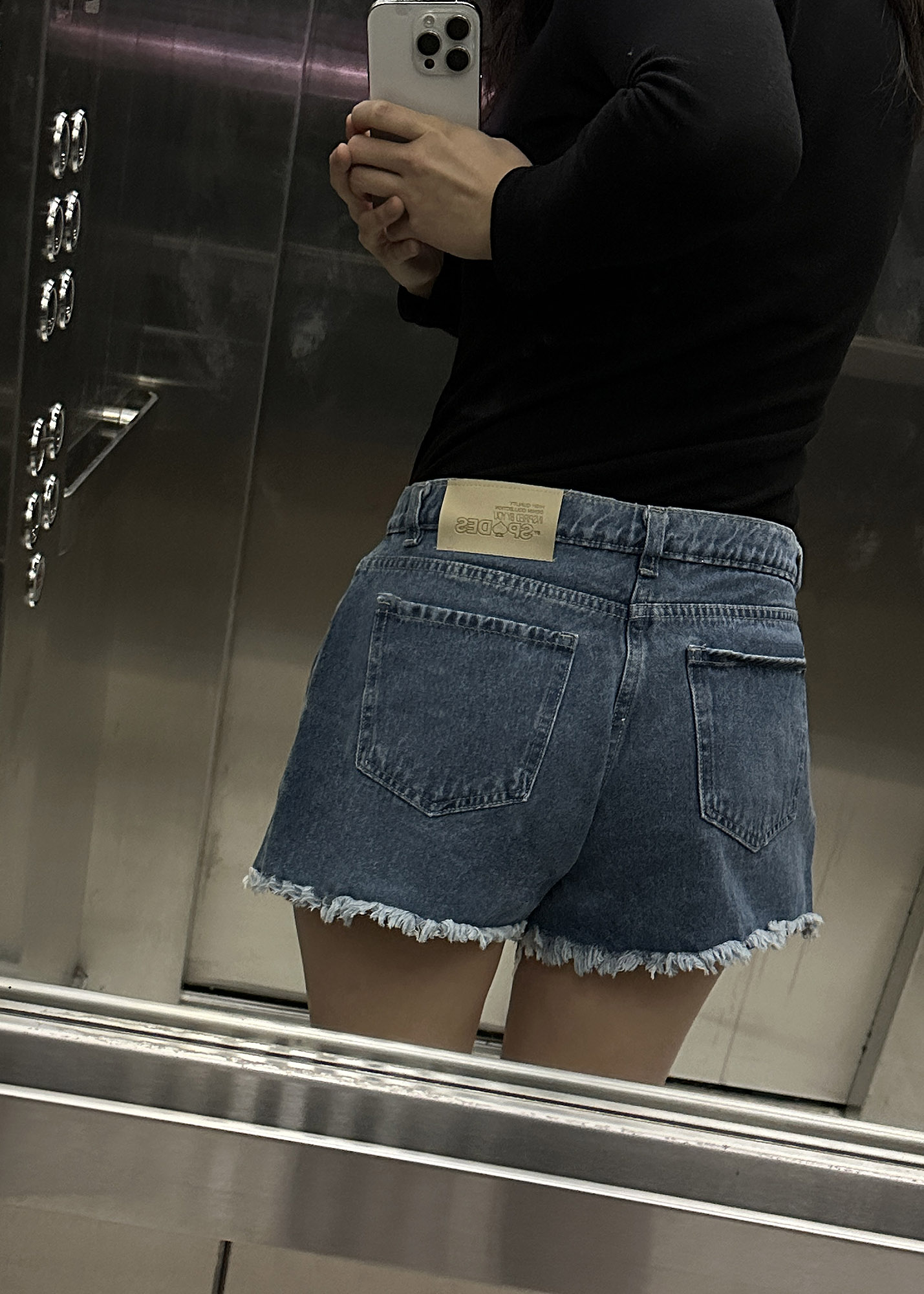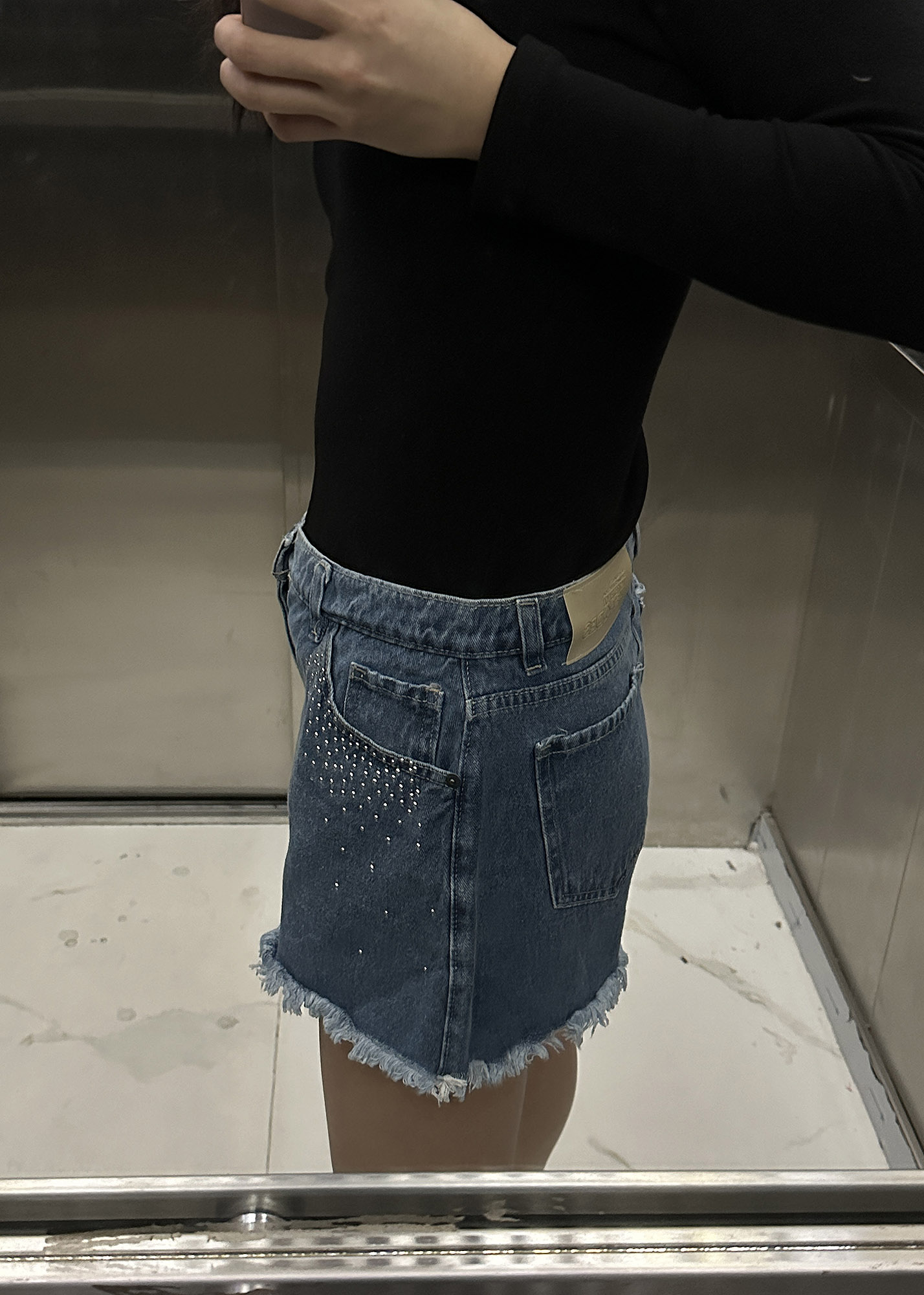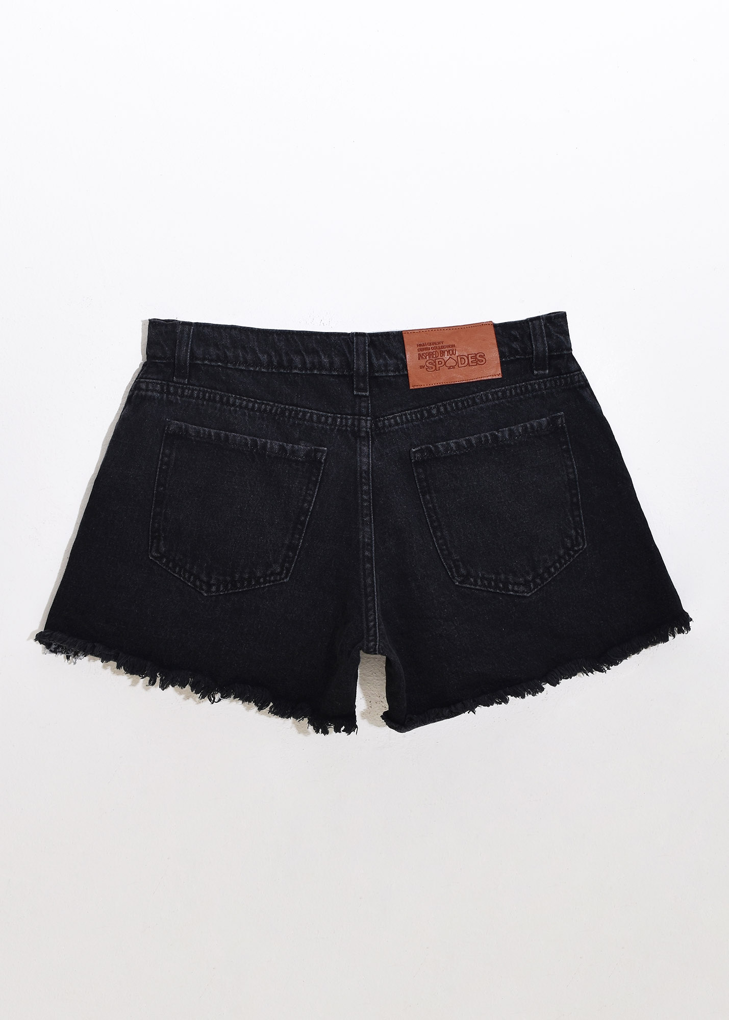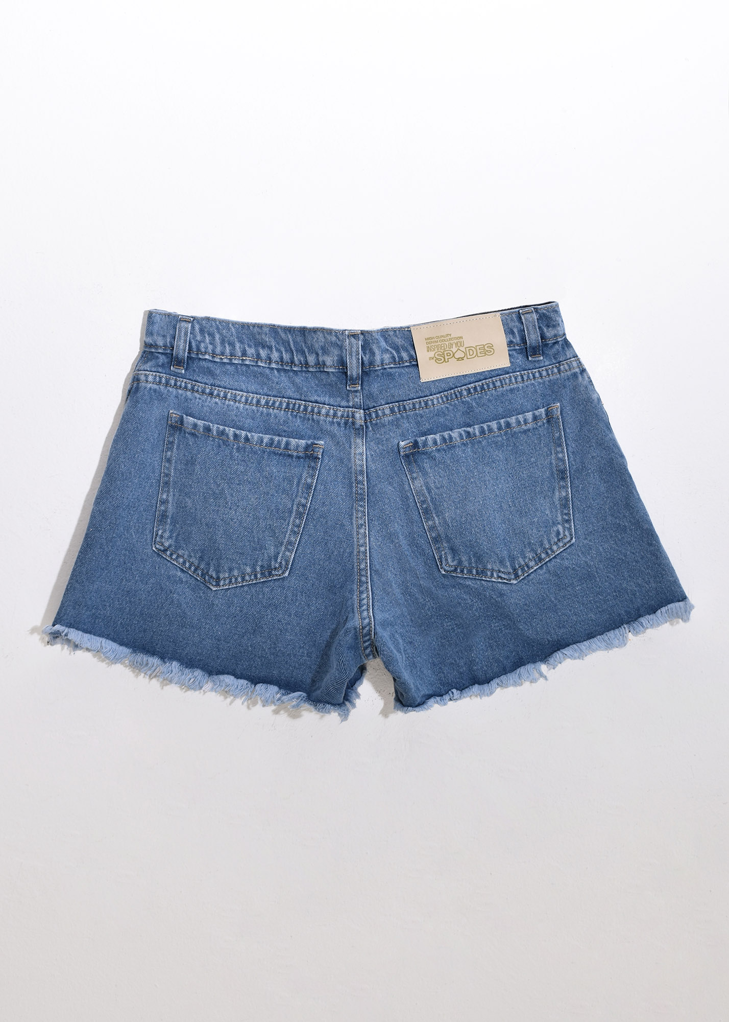 Short de jean corte estilo A – LINE, con detalle de fleco en ruedo y hotfix en forma de degradé alrededor de los bolsillos delanteros Composición: 100% algodón