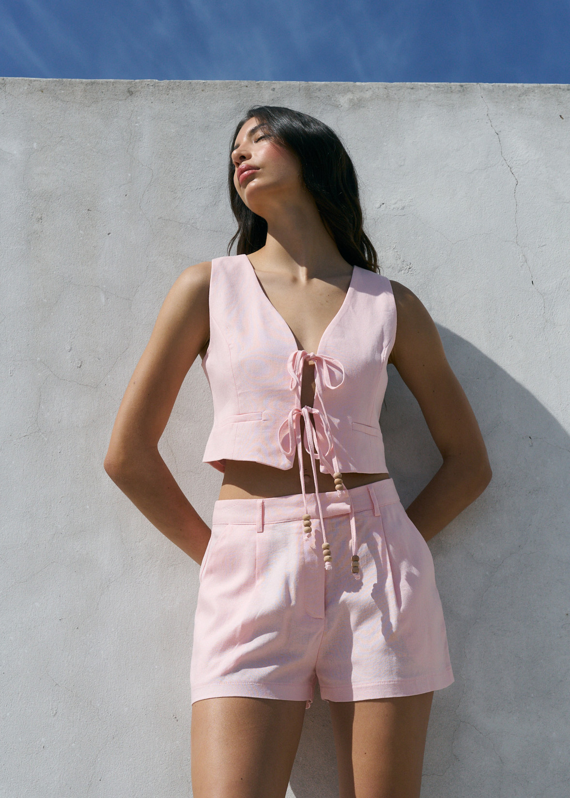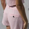 Short de lino tiro medio, con pinza delantero y trasero, bolsillos reales laterales y bolsillo falsos trasero con botones marrones