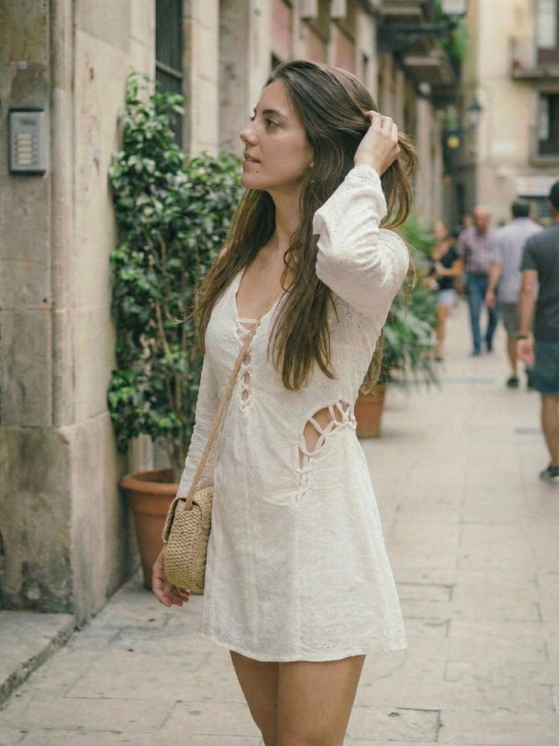 Vestido de broderie con tiras delanteras ajustables.